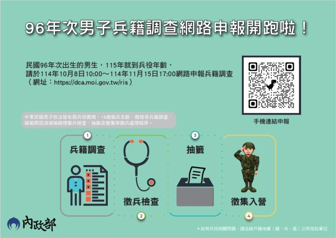 ⚠️ 96年次男生,自115年1月1日起正式成為「役男身分」,不論您是否在學.出境國外或就讀於軍警學校,都要申辦兵籍調查喔!